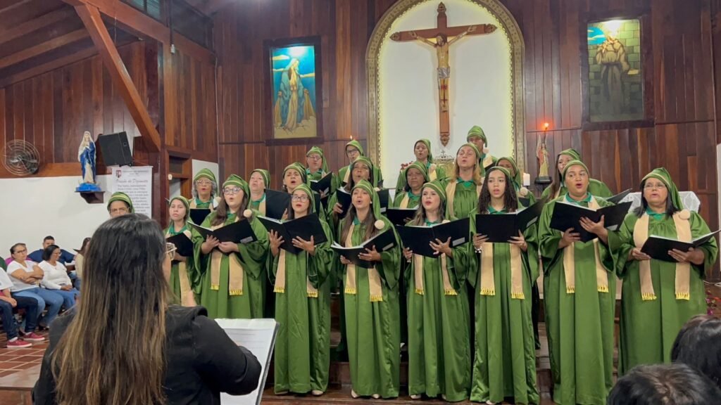 A história do Coral Divino Som é um verdadeiro exemplo de como uma ideia inspiradora pode se transformar em um projeto de sucesso. Tudo começou com o desejo da nossa amiga Luciane Francisca de realizar uma cantata de Natal. Com o envolvimento e a dedicação de todos, essa ideia cresceu e deu origem ao coral que hoje tanto nos orgulha. Natalia, Elcione, Marlúcia e Marli assumiram a responsabilidade de levar o projeto adiante, movidas por uma paixão genuína pela música e pelo propósito do coral. Diversas pessoas foram convidadas a participar, e os ensaios tiveram início com o apoio fundamental da maestrina Natalia, que nos guiou com talento e paciência nas aulas de canto. Para ajudar nos custos, realizamos promoções na barraca da igreja, que foram essenciais nesse início. Na busca por uma identidade, surgiu a sugestão de Kymberlly para o nome “Divino Som”, que foi imediatamente acolhida por todos. A logo foi criada por Herik, que mais uma vez demonstrou sua criatividade e sensibilidade artística. O coral teve uma temporada belíssima em 2023, com apresentações emocionantes nas capelas da cidade e em todos os lugares onde se apresentou, sempre levando uma mensagem de fé, amor e esperança. Em 2024, enfrentamos o desafio de garantir os recursos necessários para a continuidade dos ensaios. Com o apoio da Secretaria de Cultura de Capim Branco, conseguimos o custeio das aulas de canto e dos uniformes, o que foi fundamental para manter o projeto vivo. A dedicação de cada integrante, o tempo investido e o entusiasmo em cada ensaio foram determinantes para o sucesso do coral. Organizamos também ações para arrecadação de recursos, visando a aquisição de novos equipamentos e uniformes. Mais uma vez, a união e o esforço coletivo fizeram toda a diferença. Com tudo preparado, retomamos as apresentações, cada uma mais especial que a anterior. Além das capelas da cidade, o coral também se apresentou nos municípios de Matozinhos e Baldim, além de visitas especiais para pessoas queridas, espalhando música e esperança por onde passou. Hoje continuamos com gratidão e sempre renovando nossas energias. Que Deus continue sendo nossa inspiração e guia neste caminho de fé e música.